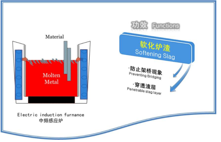 1.使用在感应炉或铁水包,添加量根据钢渣附着的程度初次使用0.01%-0.05%并放在炉底;